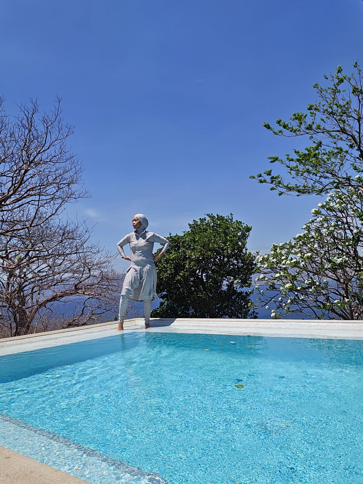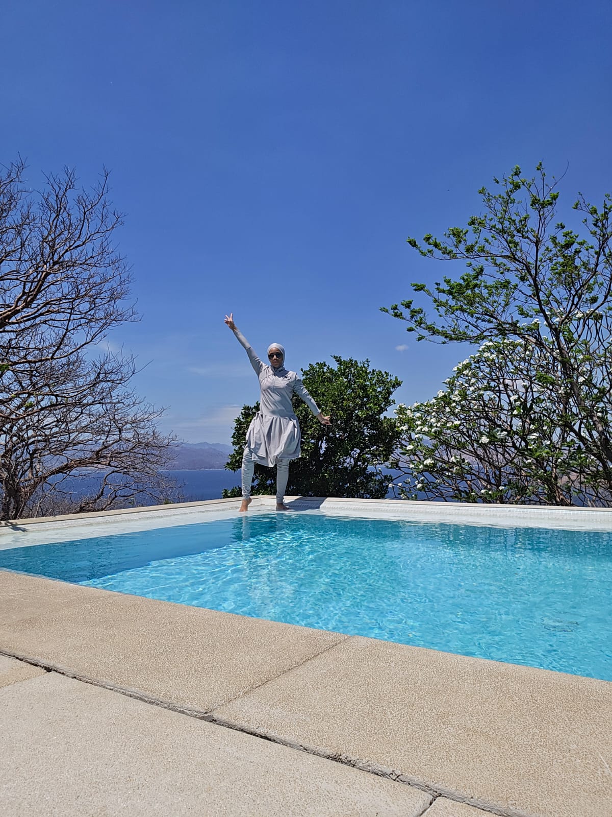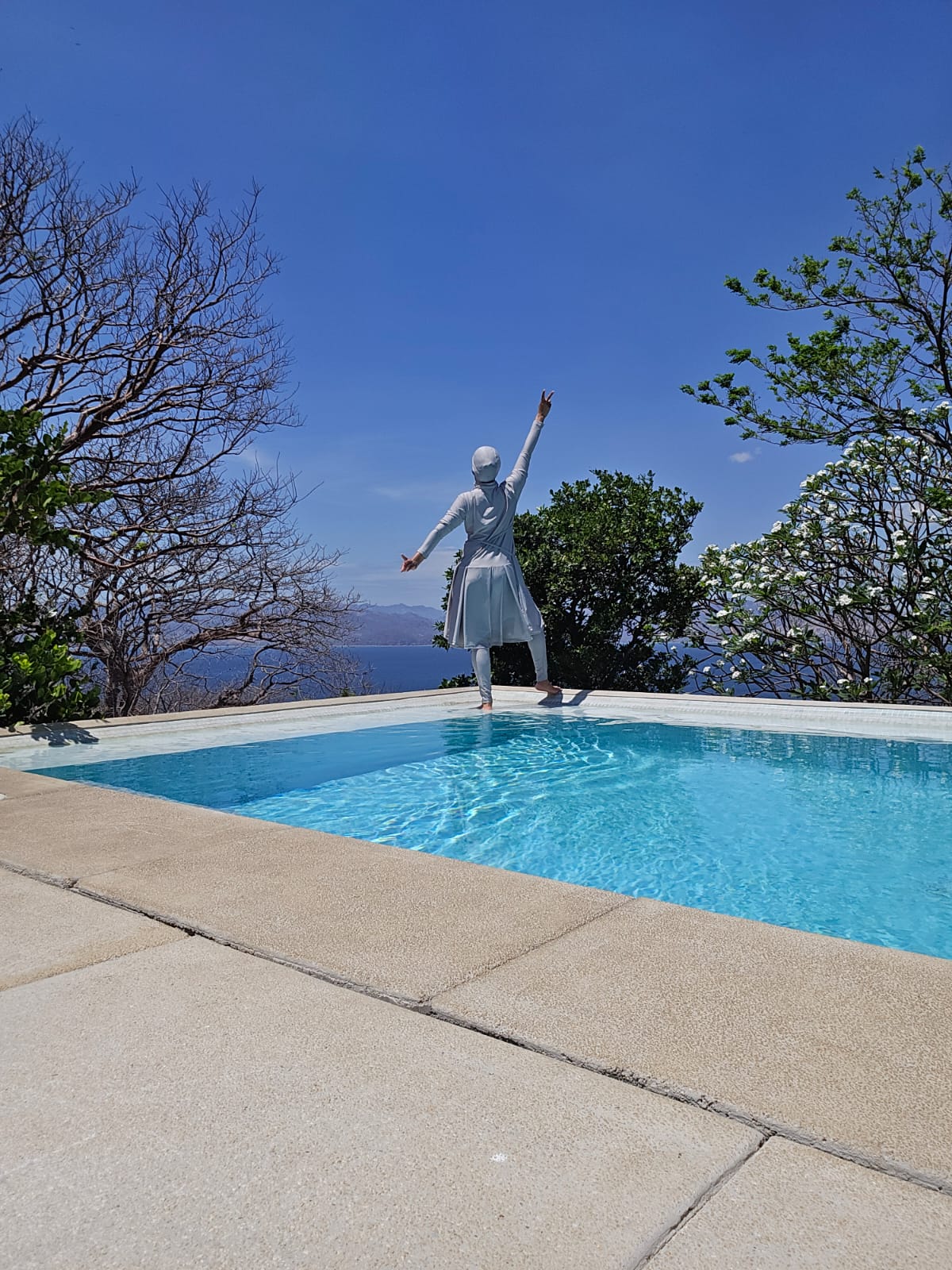 Zahra CoveredFit All-In-One Activewear™ allows you to have flexibility to move in and out of water combined with a comfortable, secure fit. Casual activewear, long sleeve full length zipper jacket with hijab, loose fit tops. Perfect outfit for the modest women Clubwear, Yoga, Running, Workout, Cycling, Skiing, Fitness, Sports Jacket or everyday casual wear.