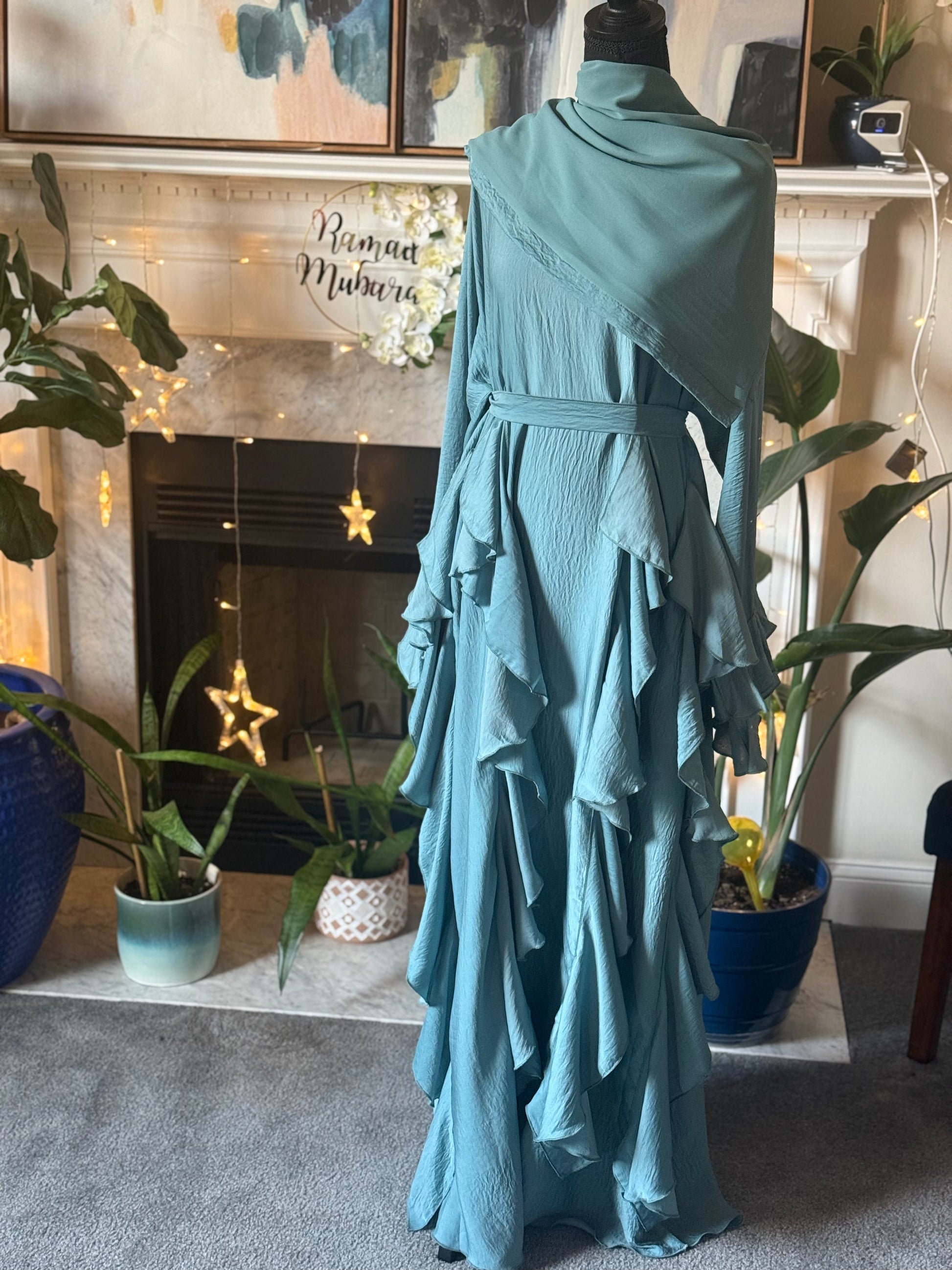 The Jazel Abayah is stunning. Its made of premium Nida material ruffles trimming down the front & back of Abayah can be worn with or without Belt bell sleeves and matching Shaylah included