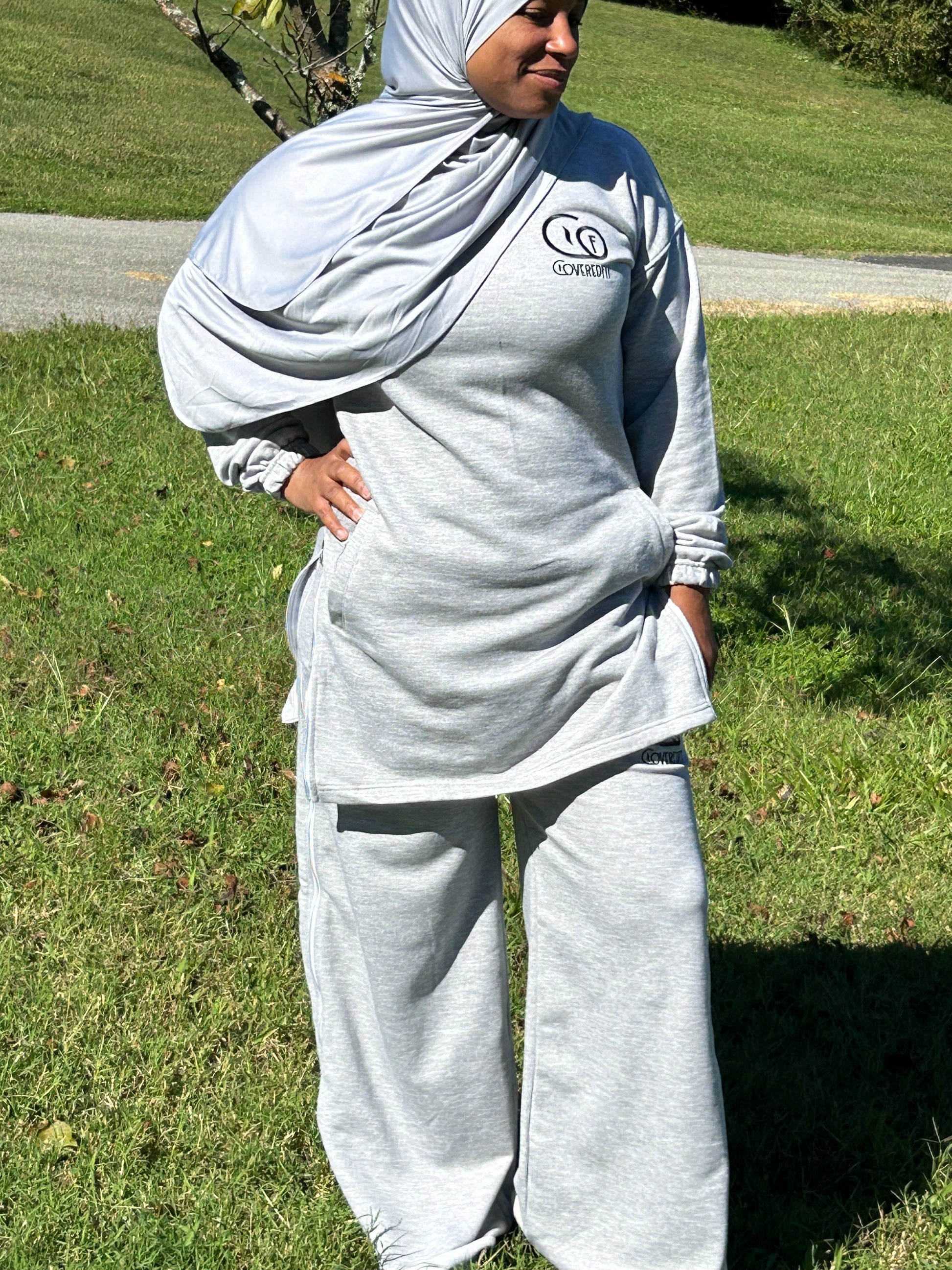 CoveredFit Zarah Zip Sweatsuit are ready to keep you comfy, covered and cute. Crafted from soft cotton, these sweatpants are complete with a smocked elastic waistband, wide leg zipper from the waist to the ankle. We've completed your chill-day look with the matching CoveredFit Sweatshirt with side zippers and pockets. Your Coveredfit Sweatsuit also includes the matching Fit Shayla.